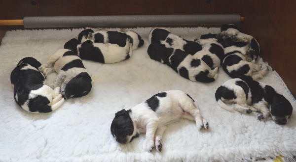 I was in the bathroom heard him shout and ran downstairs. Her first baby arrived 7.30 am a little girl, ten minutes later number 2 arrived and so it continued until 12.00am when 10 puppies had graced us with their presence.